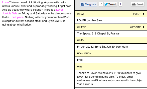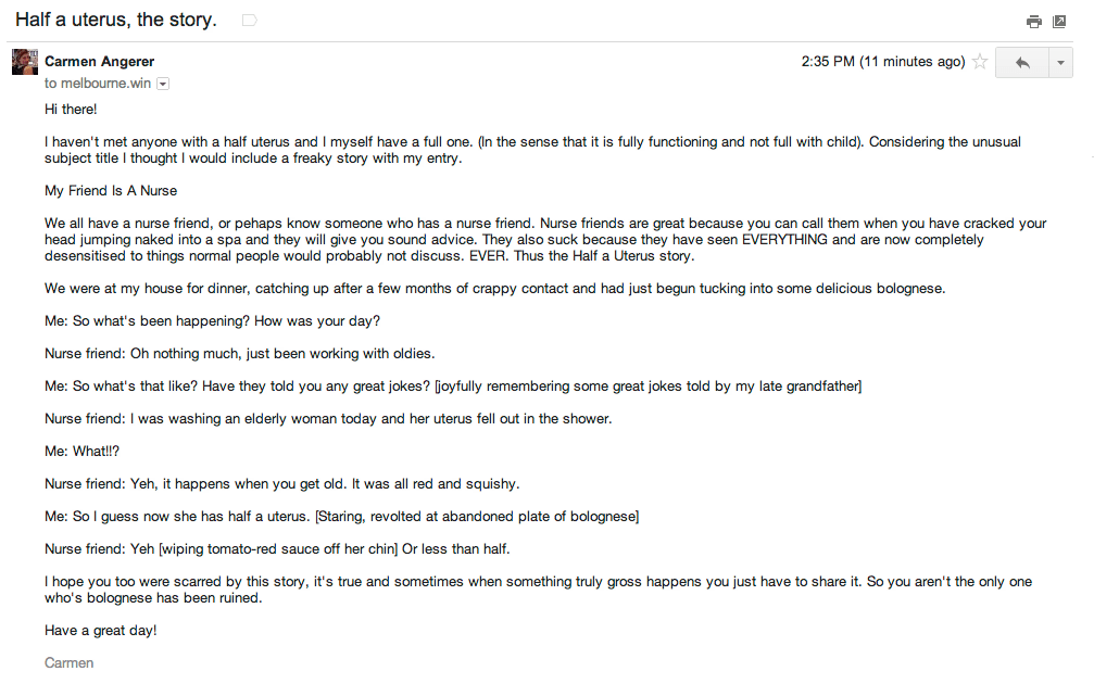 Anyway, the sole reason I entered this competition was because they asked me to send an email with the subject title ‘Half A Uterus’. It was an awesome tagline and because the person who was running the competition sounded hilarious and someone I would probably enjoy. I entered.
